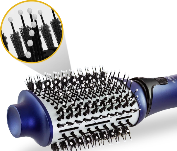 Partículas de diamante unidas à placa de Nanocerâmica, que selam as cutículas e proporcionam fios muito mais luminosos. Os cristais presentes na escova, combinados com a distribuição uniforme de calor, promovem cabelos modelados sem danos aos fios.